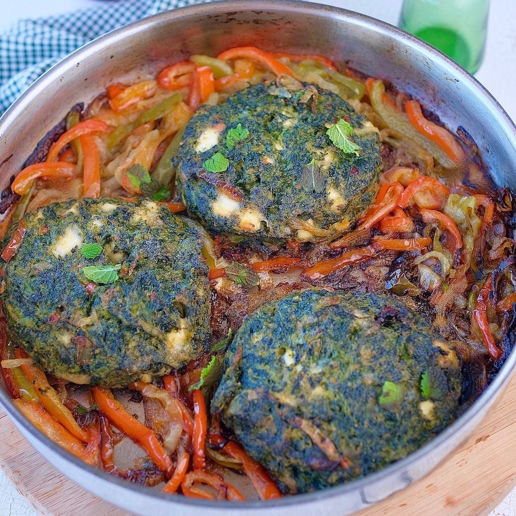 Hamburguesa de Espinacas con Queso Feta y Cebolla Caramelizada